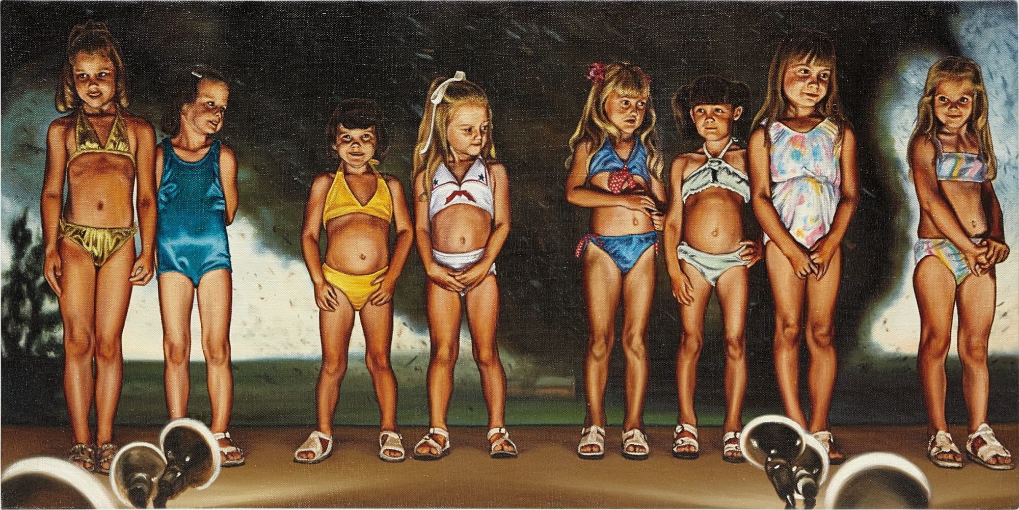 The artwork that often sees the most derision and disgust is a piece by Damian Loeb called “Little Miss Pink Tomato.” Most folks on TikTok or similar platforms cannot show you this artwork because it likely falls outside the scope of acceptable imagery on social media. Though it is not overtly sexual, the elements of the work are designed to provide a disturbing sexual quality imposed upon the subjects: prepubescent children. Barely above toddler age, the subjects of the 1995 painting are eight little girls dressed in children’s style bathing suits, mostly small, ill-fitting bikinis that show off their shapeless forms as they stand before a faceless dark crowd just beyond the too-bright pageant lights. Loeb’s use of light here is telling: the way it shines over the girls’ tanned skin almost like they’ve been oiled and the backs of the lights in the foreground insist upon an unseen audience—of which we are a part. As if these elements weren’t enough to drive home the point of the work, Loeb takes us one step further into the distinct horror upon which we gaze. Behind the girls, the backdrop of the stage is not that of glittering pageant decor but almost appears as though it were some leftover of a previous production (The Wizard of Oz, perhaps?) but the image is purposeful and poignant—that of a black, twisting tornado barreling across a rural landscape and tearing through tiny structures, the debris flying haphazardly through hazy air as it rips up once-unmarred farmlands and destroys dozens, if not hundreds, of lives in only minutes.