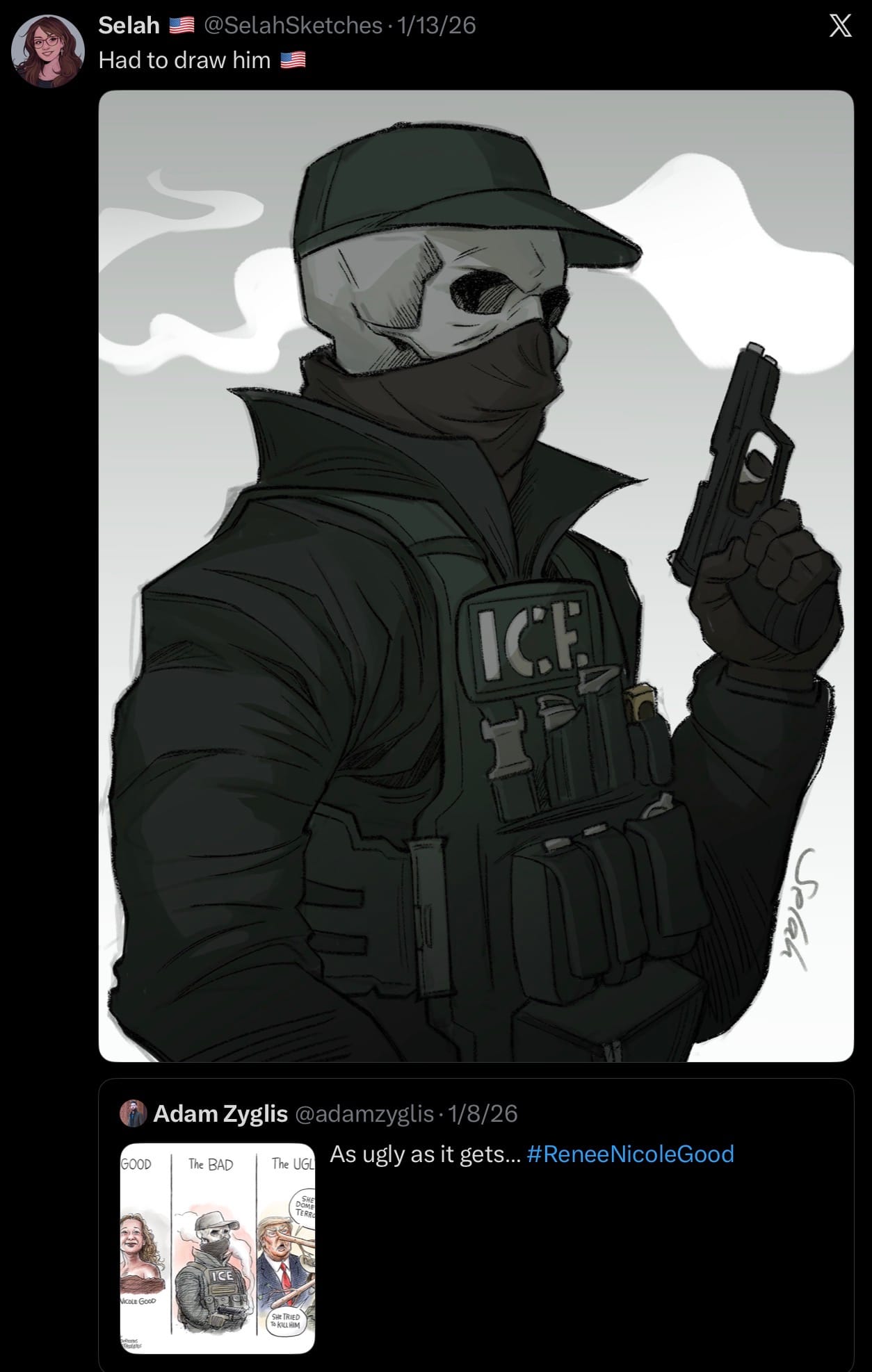 So what was the fanart in question? Brace yourself. Buffalo News political cartoonist Adam Zyglis posted a strip which turned ICE agent and murderer Jonathan Ross into a skull-faced monster, depicting the popular sentiment of today—that this rogue agency has become the face of fear and death, the skull an obvious callback to the totenkopf of the Third Reich’s most feared military entity: the Schutzstaffel or the Gestapo. Selah, who did not respond to my request for comment on her motivations for the artwork, redrew the image of the skull-faced agent, explicitly stating on Twitter that her work was “pro-ICE.” Of course, for anyone who is even mildly artistically aware, one does not generally associate skulls with the good guys, making this certainly a…choice…