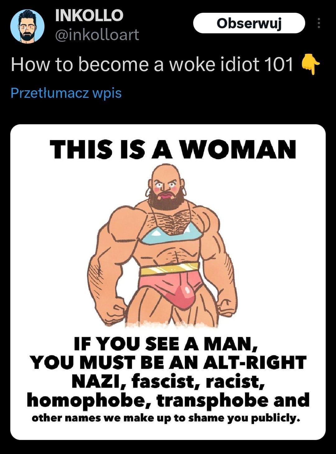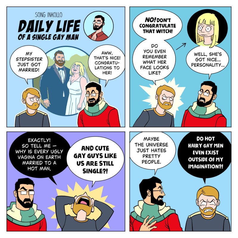In addition to right-wing trash posting, some of his other comics feature elements that don’t land well with a large amount of the queer crowd. While it’s understood that gay men have their own kinda “thing” going on in certain places and their culture can definitely have some gaps in acceptability, it probably isn’t a stretch to say that outright misogyny is usually looked down upon. At least one of Inkollo’s comics featured a side character referring to a woman as a “vagina” while also decrying her ugliness and unworthiness to land an objectively good-looking husband. This blatant dehumanization of women, and especially women who don’t match up with current standards of beauty, hit pretty sideways with the general public on Twitter.