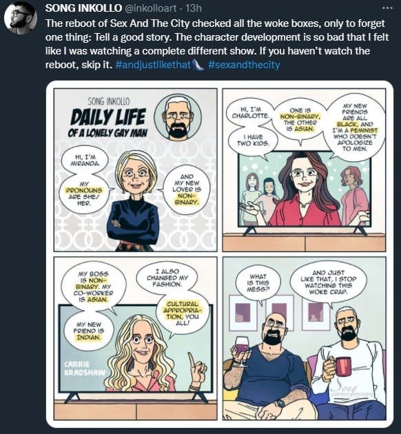 Former followers and patrons to his Patreon have lamented that though some of his comics were entertaining in the past, they had to leave him simply due to the boundary-crossing he does when it comes to what some users call “brain rot” and “anti woke nonsense.” Every so often his real thoughts would slip out from between the cracks in his wholesome “white” gay man persona and when they did, it was often far too much too quickly. Whole comics about how much he hated the reboot of Sex and the City because it’s “woke crap” (did he watch the original series???) and an instagram post about how much he doubts women who accuse high-profile men of sexual harassment have been brought up when former followers chat about their negative impressions of his politics, their disappointment in his conduct apparent in their tweets.